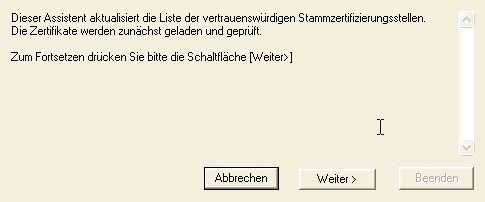 Nach dem Neustart des Rechners versucht die Installation vertrauenswürdige Stammzertifizierungsstellen zu laden. Gehen Sie bitte auf „Weiter“.