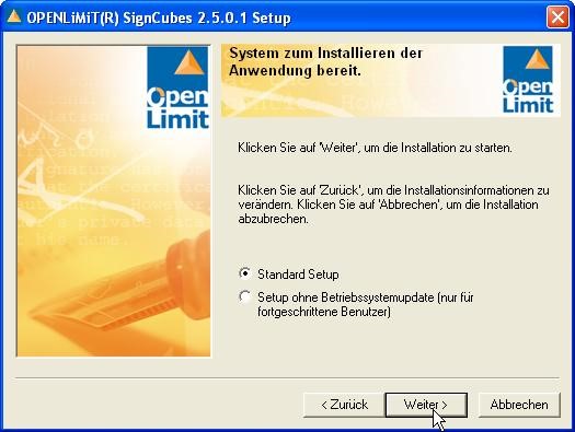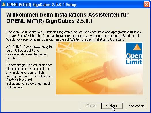Der Installationsassistent für OpenLimit startet. Gehen Sie bitte auf