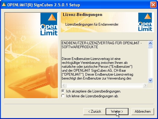 Sie müssen den Lizenzbestimmungen von OpenLimit zustimmen, um die Installation zu starten. Gehen Sie dann auf „Weiter“.