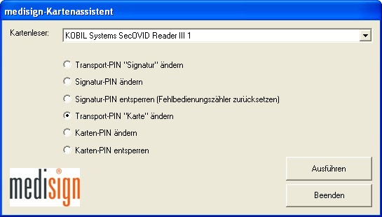 Wählen Sie den zweiten Menüpunkt „Transport-PIN ändern“ vom medisign-Installationspaket aus und stecken Sie Ihren HBA in den Kartenleser.