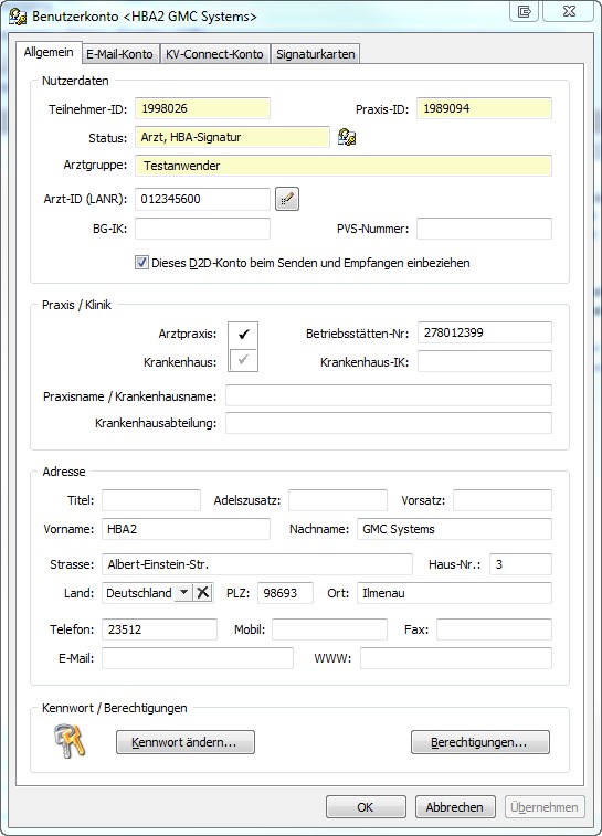 Es wird zunächst die Arztliste Client geladen und dann die am Client konfigurierten Benutzer angezeigt. Dass es sich um ein HBA-Konto handelt, erkennen Sie an dem kleinen Symbol mit dem Schlüssel vor dem Eintrag