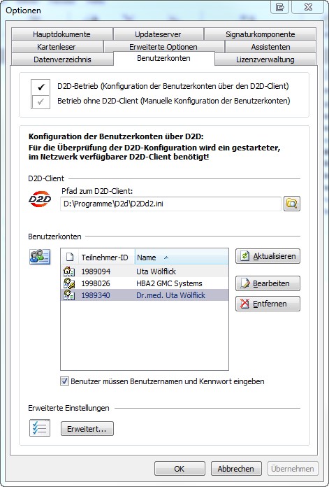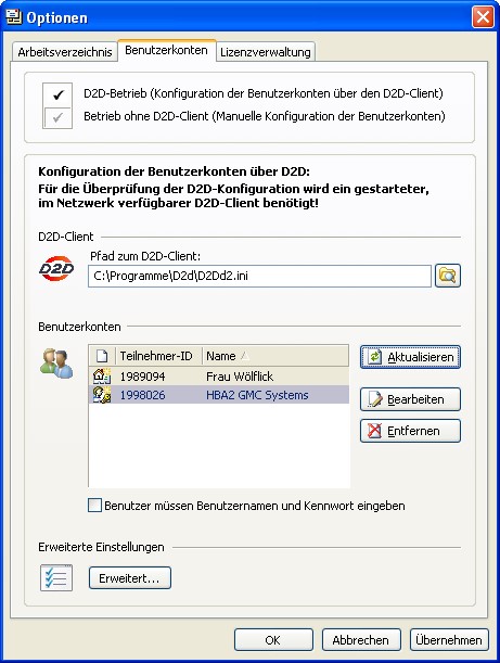 Benutzerkonten angezeigt. Klicken Sie auf „Aktualisieren“, um einen neuen D2D-Nutzer (HBA) vom D2D-Client in das GMC PaDok zu übernehmen.