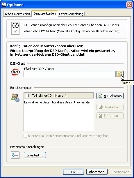 Im Anschluss wählen Sie den Pfad zum D2D-Client und gehen auf „Aktualisieren“.