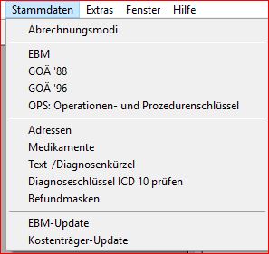 Der in Iatropro eingearbeiteten EBM wird über den Menüpunkt - Stammdaten - EBM aufgerufen
