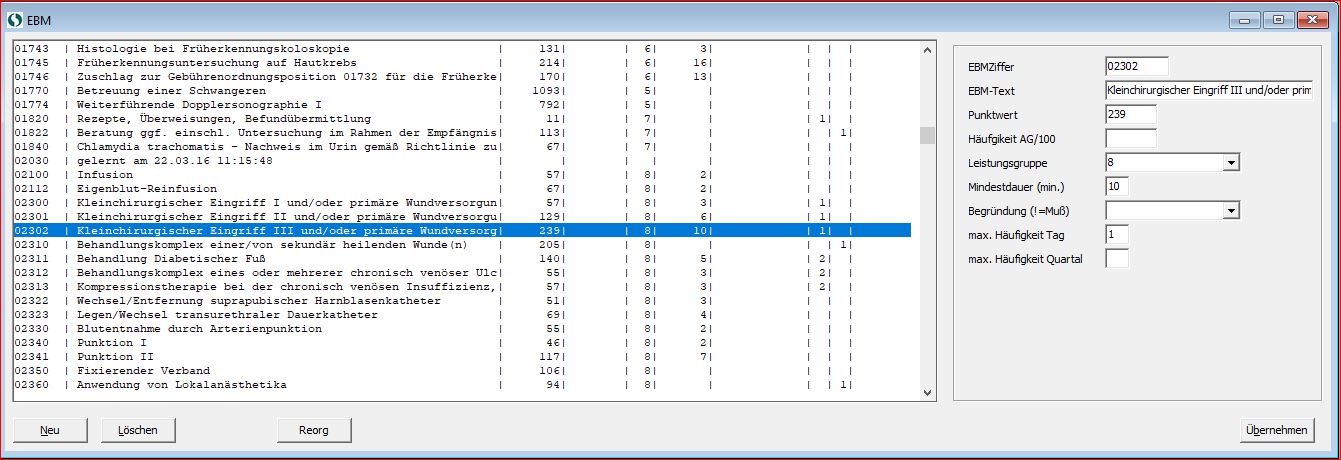 Dieser EBM-Katalog beeinhaltet im ersten Schritt nicht alle im KBV-Gebiet gültigen EBM-Ziffern, sondern lernt die notwendigen Ziffern bei der ersten Eingabe.
