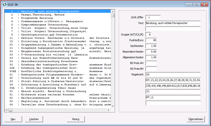Die Maske GOÄ96 teilt sich in zwei Bereich auf