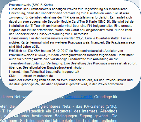 Im Grunde kennt man die TI bereits. Seit Jahren bieten die KVen ein vergleichbares Netz - das KV-Safenet (SNK). Technisch gesehen, ist die TI das gleiche. Auch die TI ist selbstverständlich ein Bestandteil des Internets. Allerdings handelt es sich dabei um ein abgeschottetes Netz, das nur unter bestimmten Bedingungen Zugang gewährt. Die transportierten Daten werden durchweg verschlüsselt übertragen. So teilen sich die Datenpakete der TI mit dem restlichen Internetdaten-Verkehr zwar das Medium, sind aber für dritte (in der Theorie) nicht lesbar. “Zugang” zur TI bekommt nur, wer die richtige Kombination aus Konnektor, PIN und SMC-B-Karte vorweisen kann.