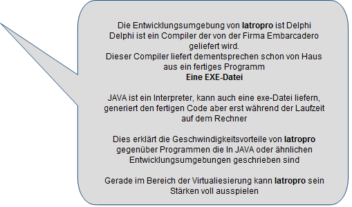 Durch diese Entwicklungsumgebung (KEIN JAVA) ist gewährleistet, dass das Programm extrem schnell ist, nur auf dem Server installiert werden muss und auf den Clients keine weiteren (bis auf verschiedene Verknüpfungen) Programme installiert werden müssen